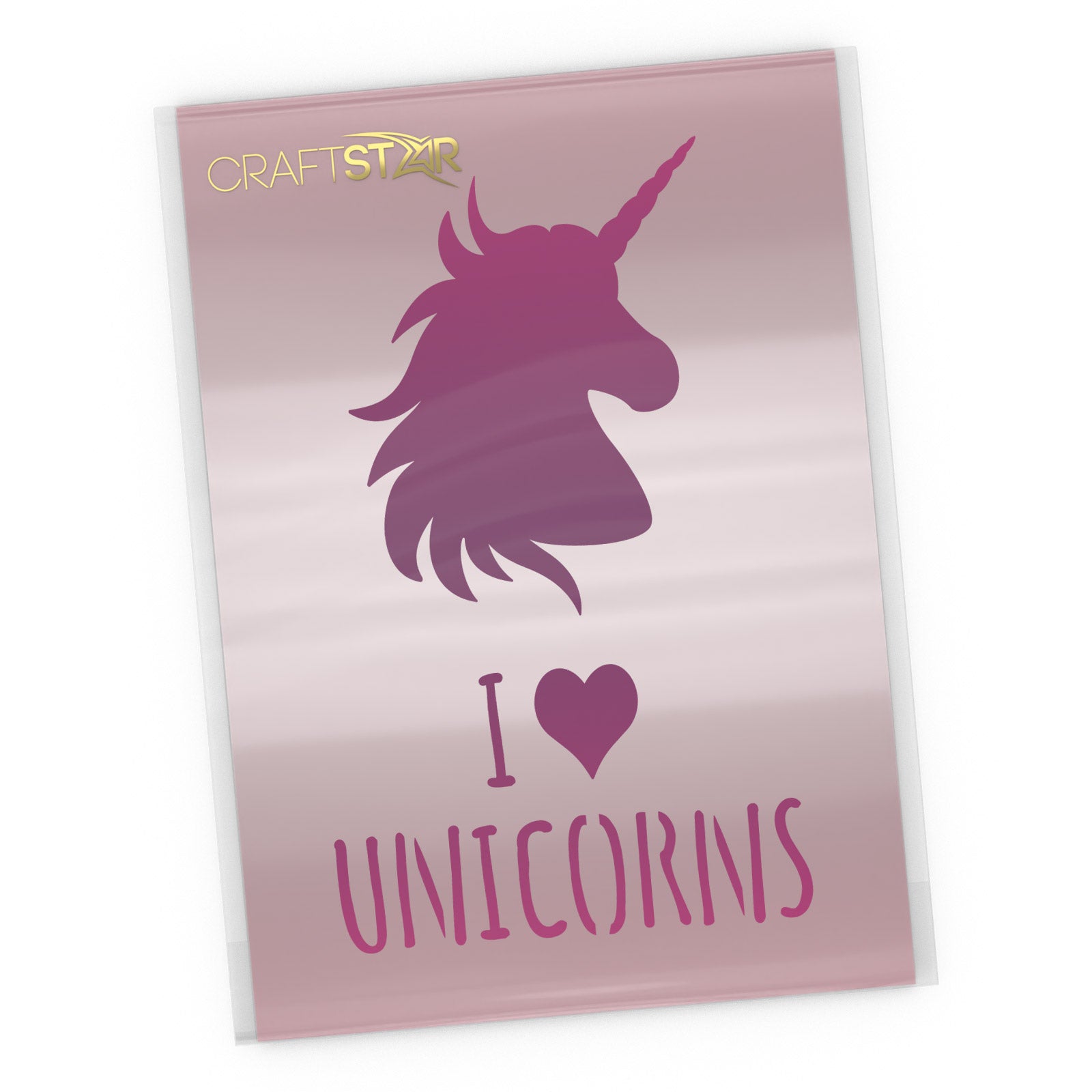 Our Unicorn quote stencil features the silhouette of a unicorn head and the text I Love Unicorns. This stencil is perfect for all your fairy tale paper arts and crafts (card making, scrapbooking and crafts) and children's magical home decor projects.